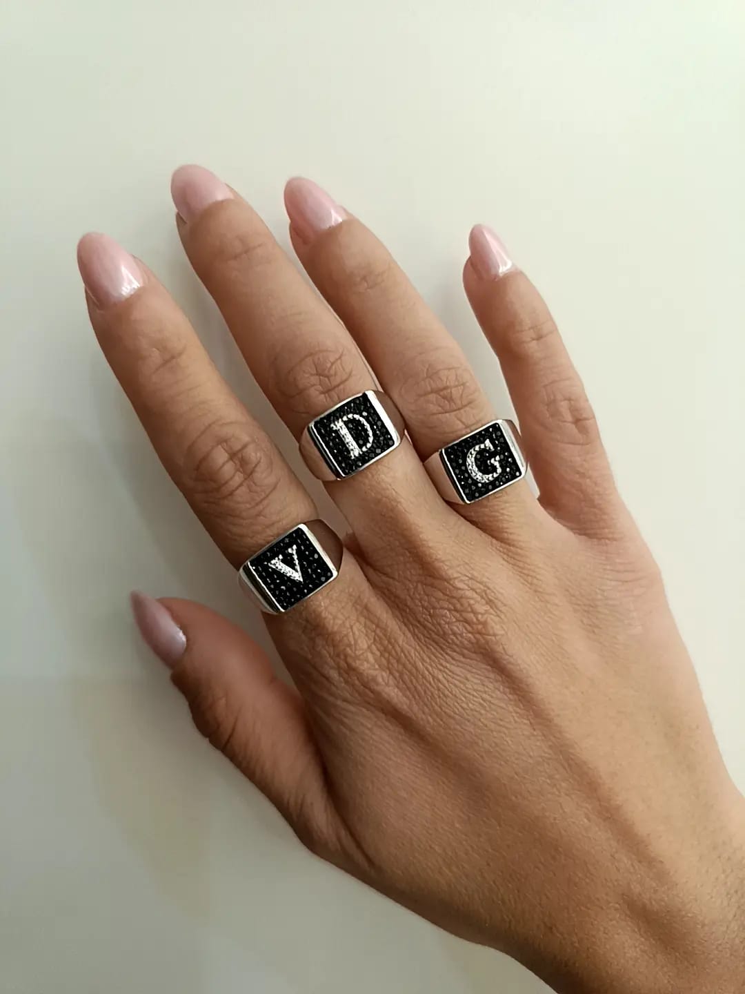 Anello chevalier iniziale quadrato in Argento 925 regolabile. Realizzato con cura e attenzione ai dettagli, perfetto per ogni occasione, dal lavoro alle serate speciali.
