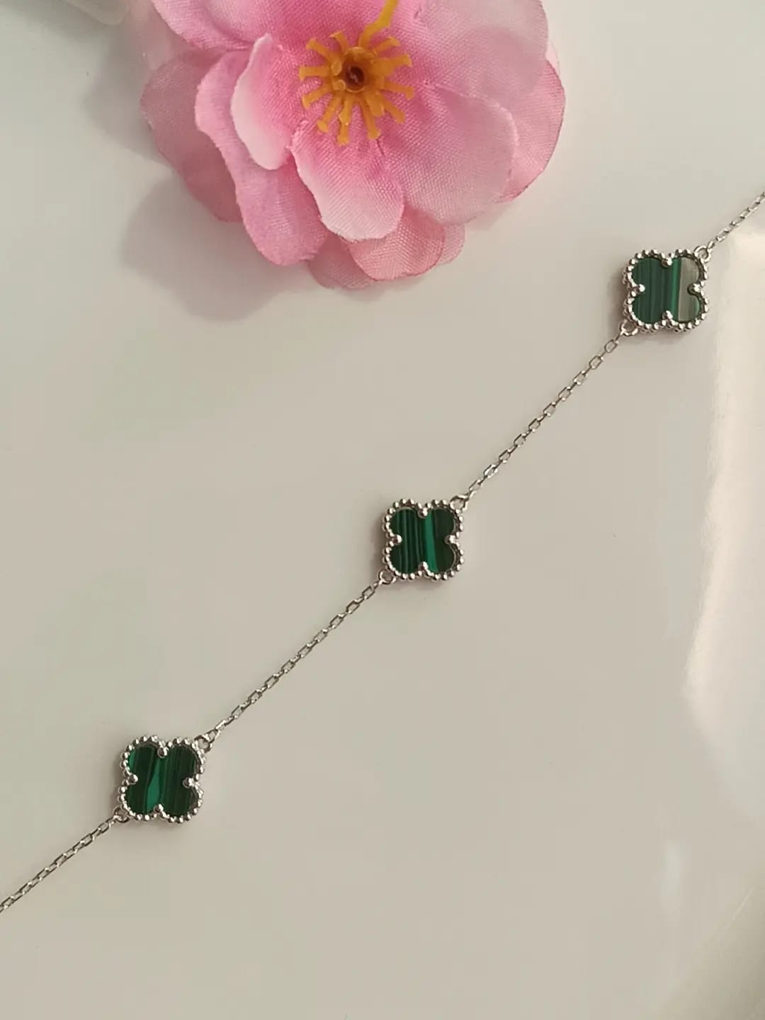 Bracciale in argento 925. Il nostro bracciale big flower elegante presenta un motivo a fiore di color verde. Perfetto per aggiungere un tocco di raffinatezza a qualsiasi outfit. Regolabile per adattarsi perfettamente al tuo polso.