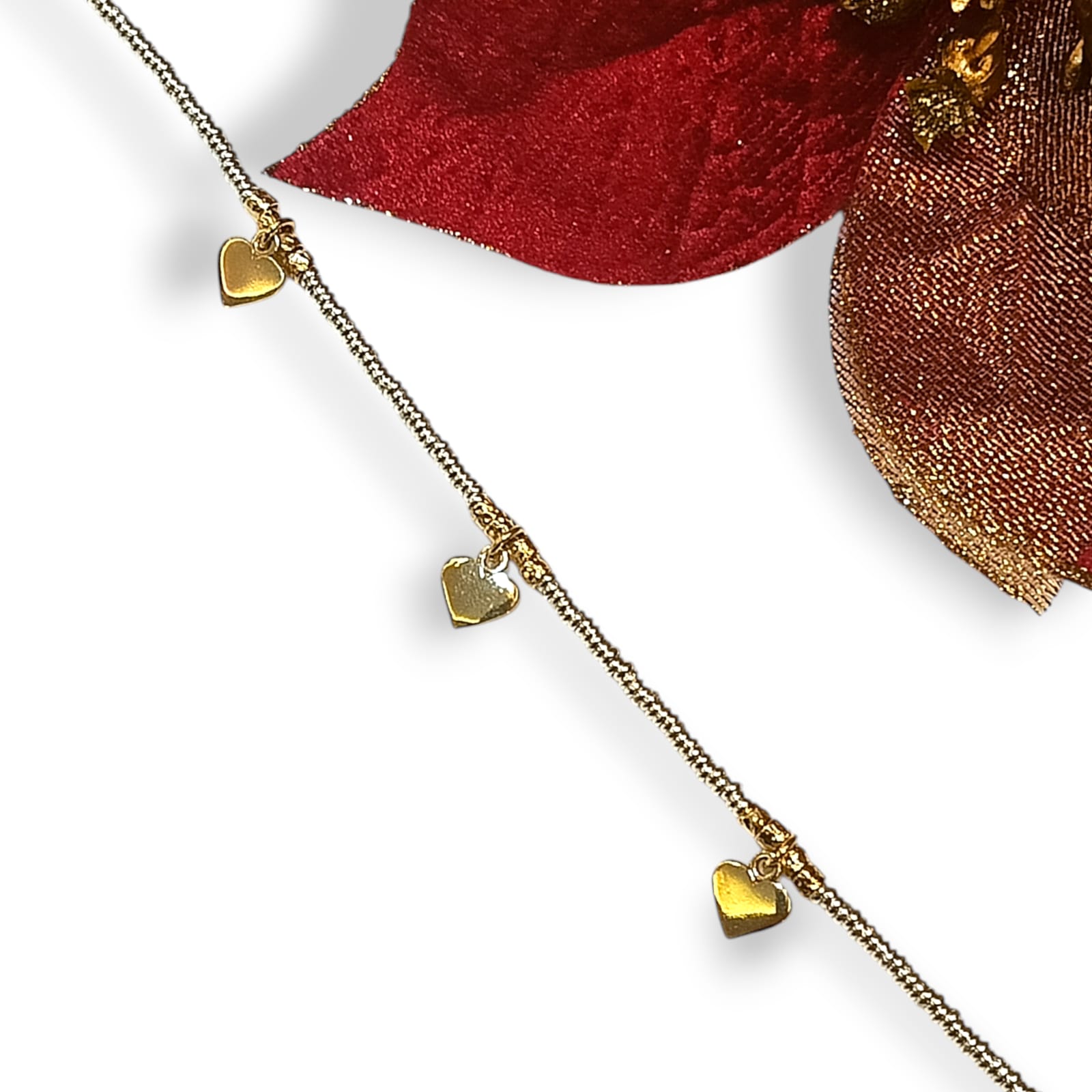 Bracciale in argento 925 con cuoricini pendenti in argento placcato oro. Aggiungi un tocco di luce al tuo look con il Bracciale tris di cuori. Regolabile per adattarsi perfettamente al tuo polso.