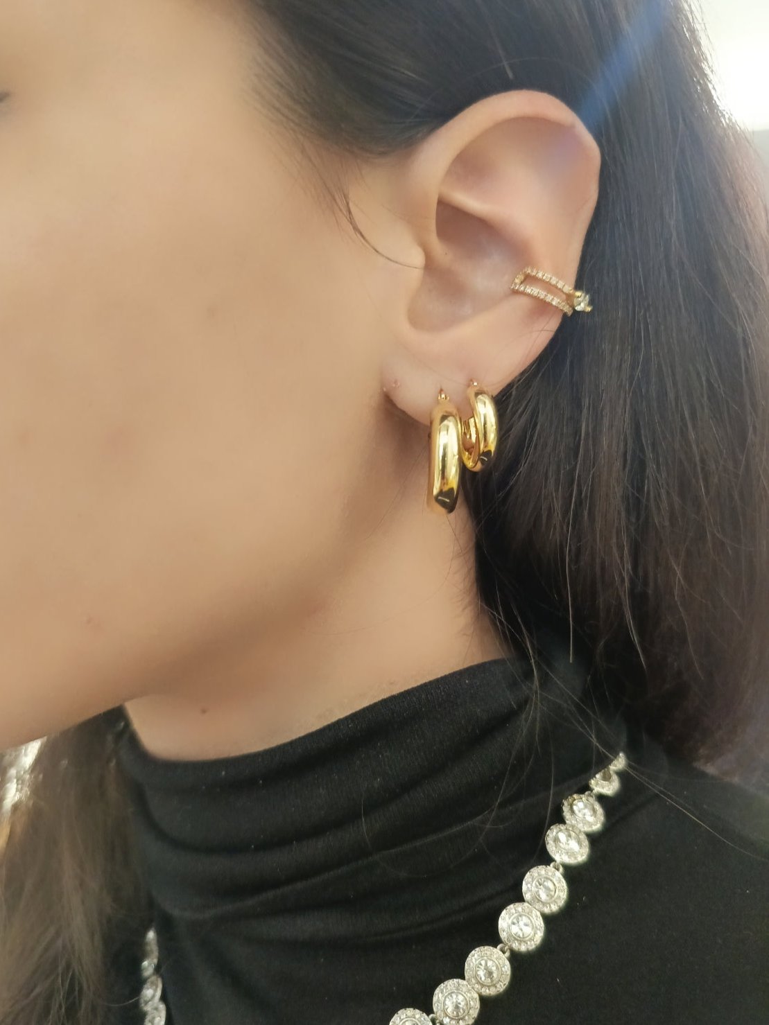 Coppia di orecchini a cerchio in argento 925 placcato oro disponibile in due dimensioni da 9 mm e da 11 mm. Indossa il nostro orecchino "Queen" per avere un look unico.