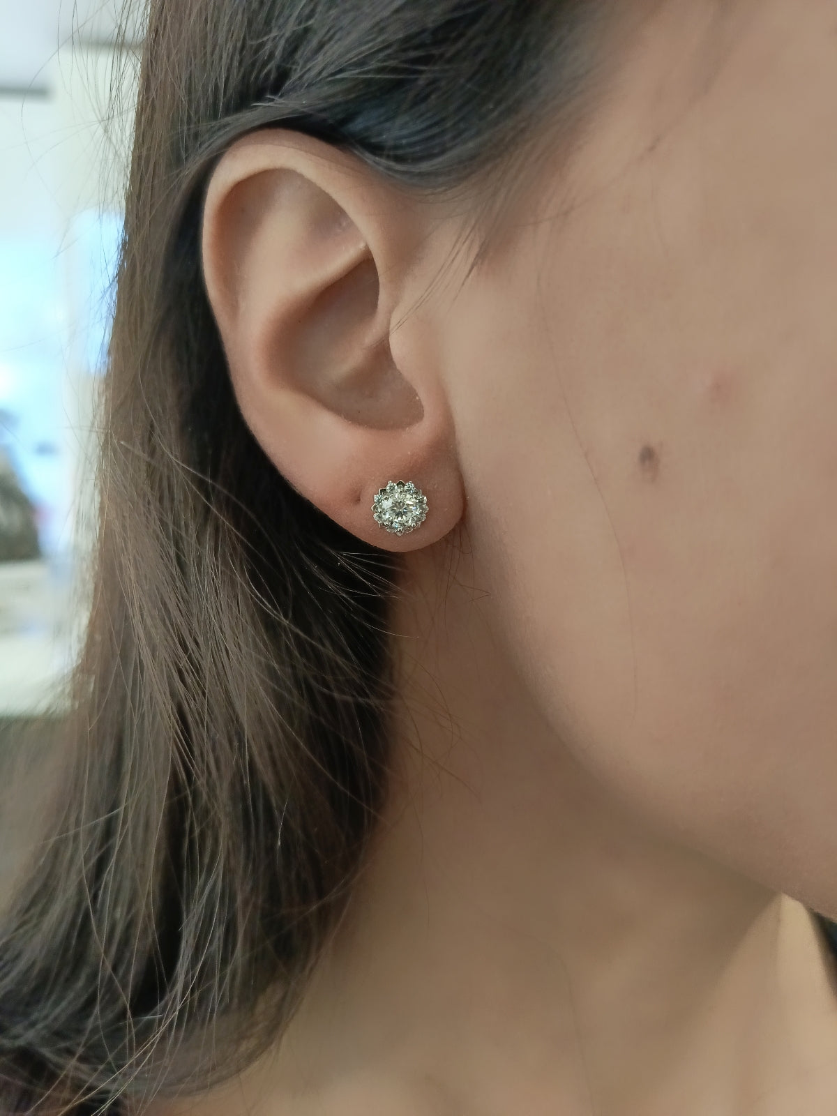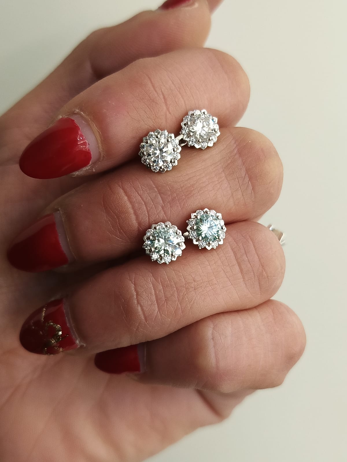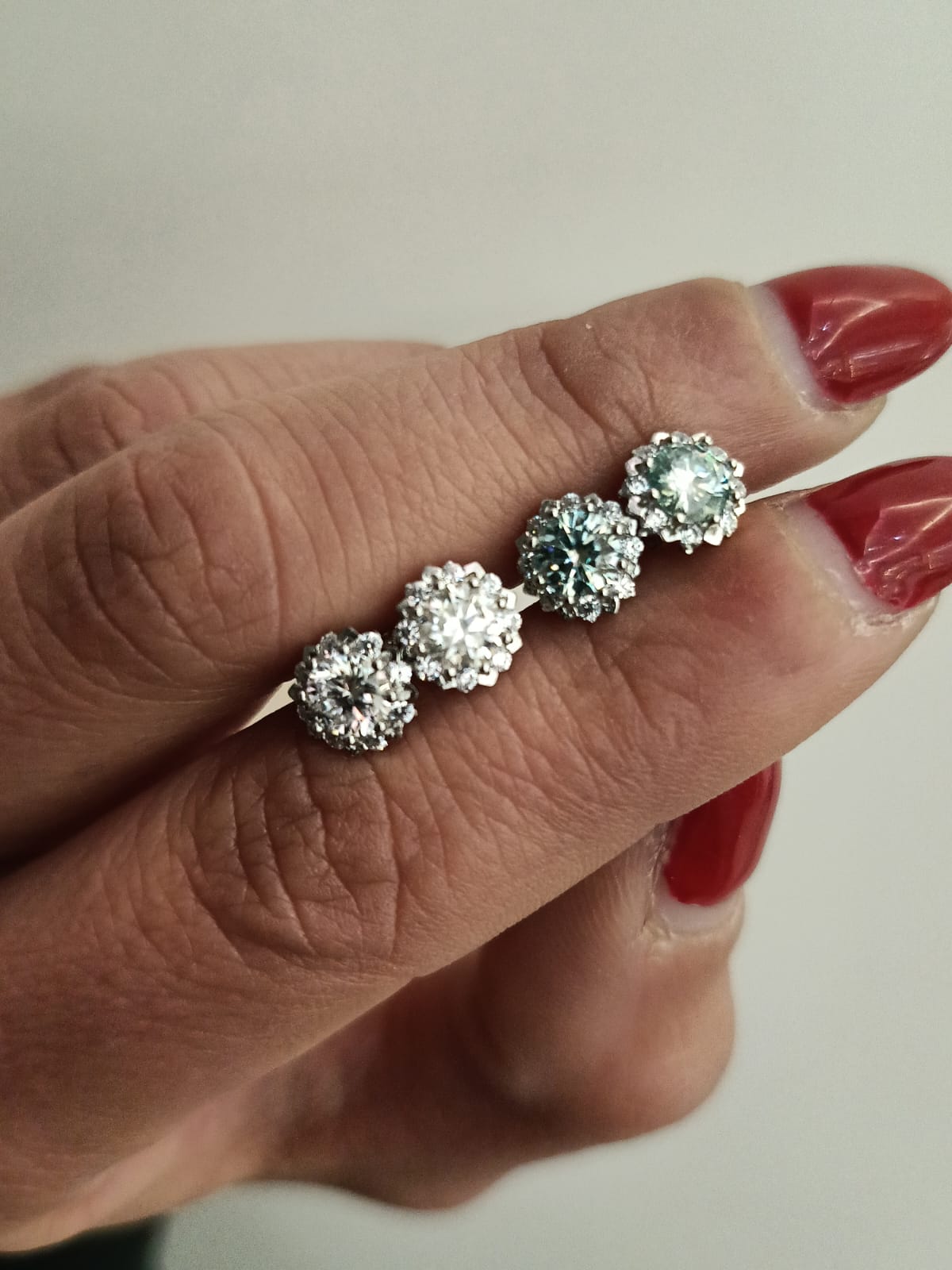 Coppia di orecchini a fiore con pietra Moissanite centrale da 0,5 ct. cadauna per un totale di 1 ct. di colore azzurro o bianco, realizzata in argento 925, con certificato della pietra.