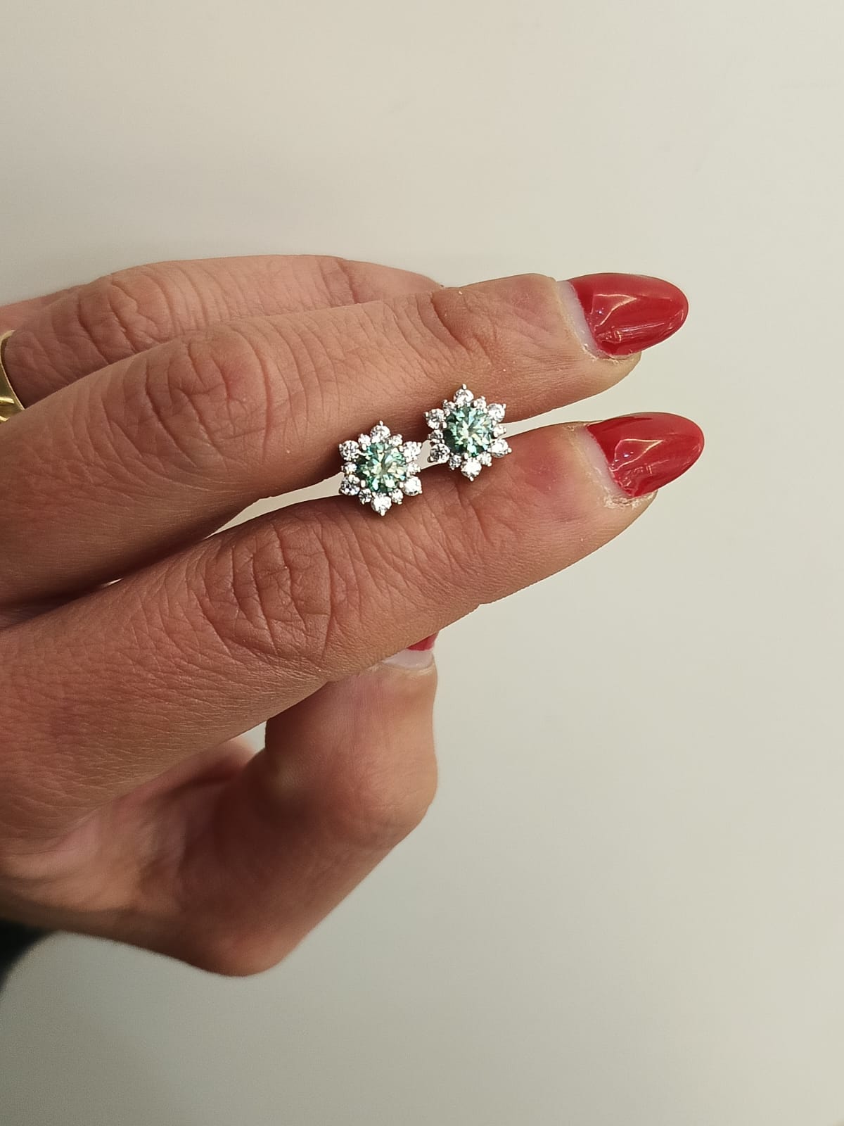 Coppia di orecchini a stella con pietra Moissanite centrale da 0,5 ct cadauna per un totale di 1 ct, di colore verde acqua, realizzata in argento 925, con certificato della pietra.