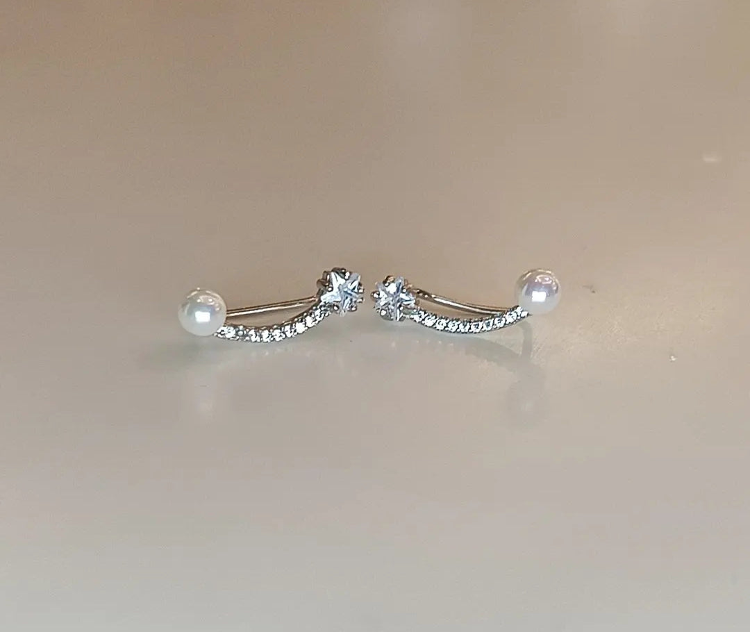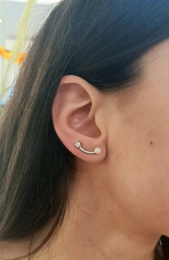 Eleva il tuo stile con il nostro raffinato orecchino gioiello che avvolge con eleganza l'intero lobo dell'orecchio. Questo esclusivo gioiello è caratterizzato da una splendida perla ad un'estremità, dall'altra estremità uno zircone bianco e tra i due, lungo tutto l'orecchino zirconi scintillanti, creando un'armoniosa combinazione di glamour e sofisticazione.
